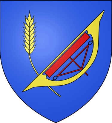 D’azur à l’épi de blé d’or à dextre, tigé et ployé en bande, à la navette de passementier du même, posée en barre, garnie d’une bobine de gueules et brochant sur la tige de l’épi.